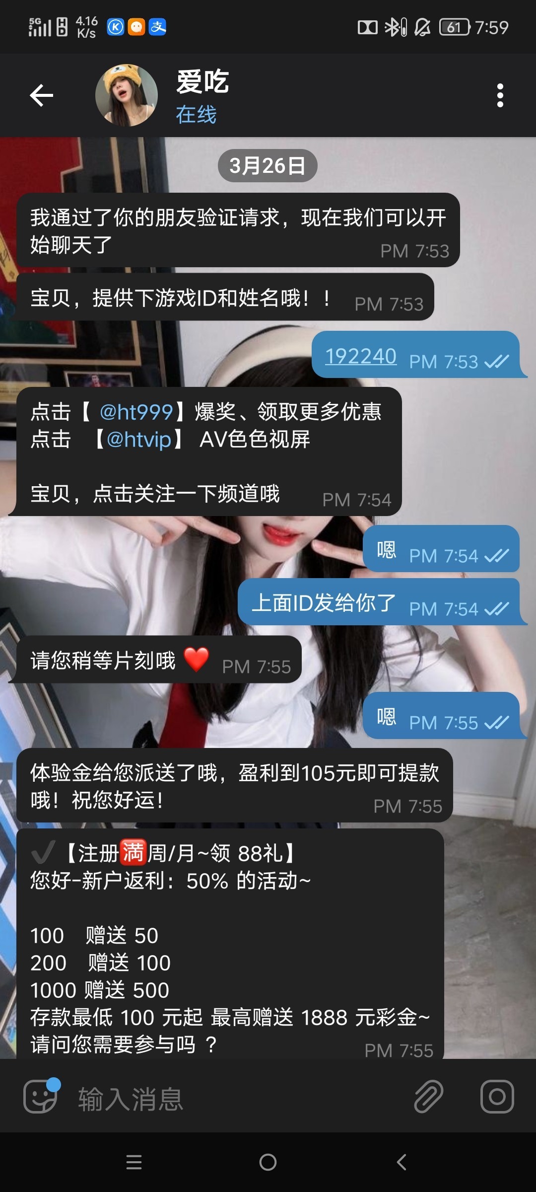 注册账号,绑定银行卡/支付宝联系在线客服,让你添加专员POP发ID 给她申请即可,打满105提现,亲测到账6彩金,出款自测!